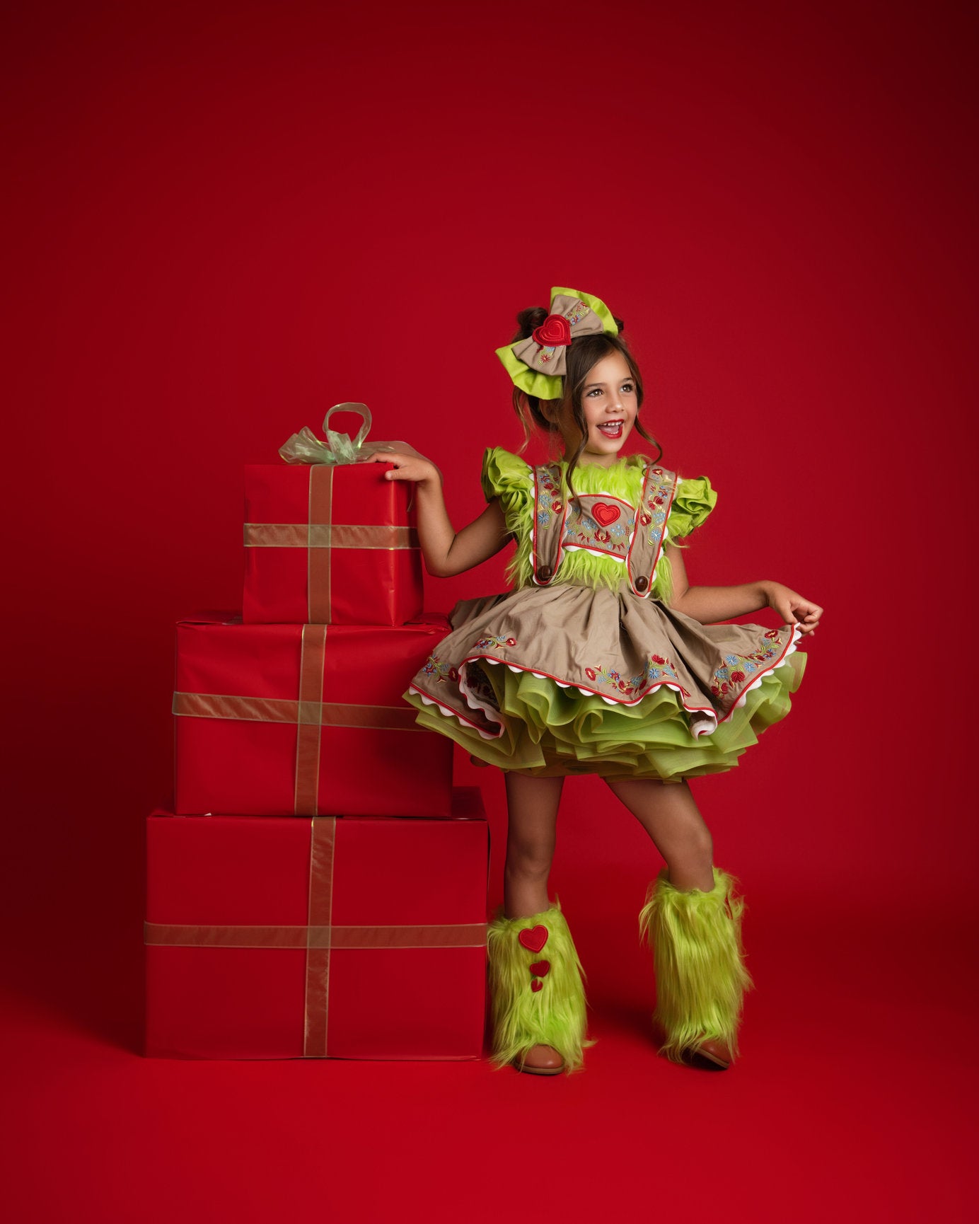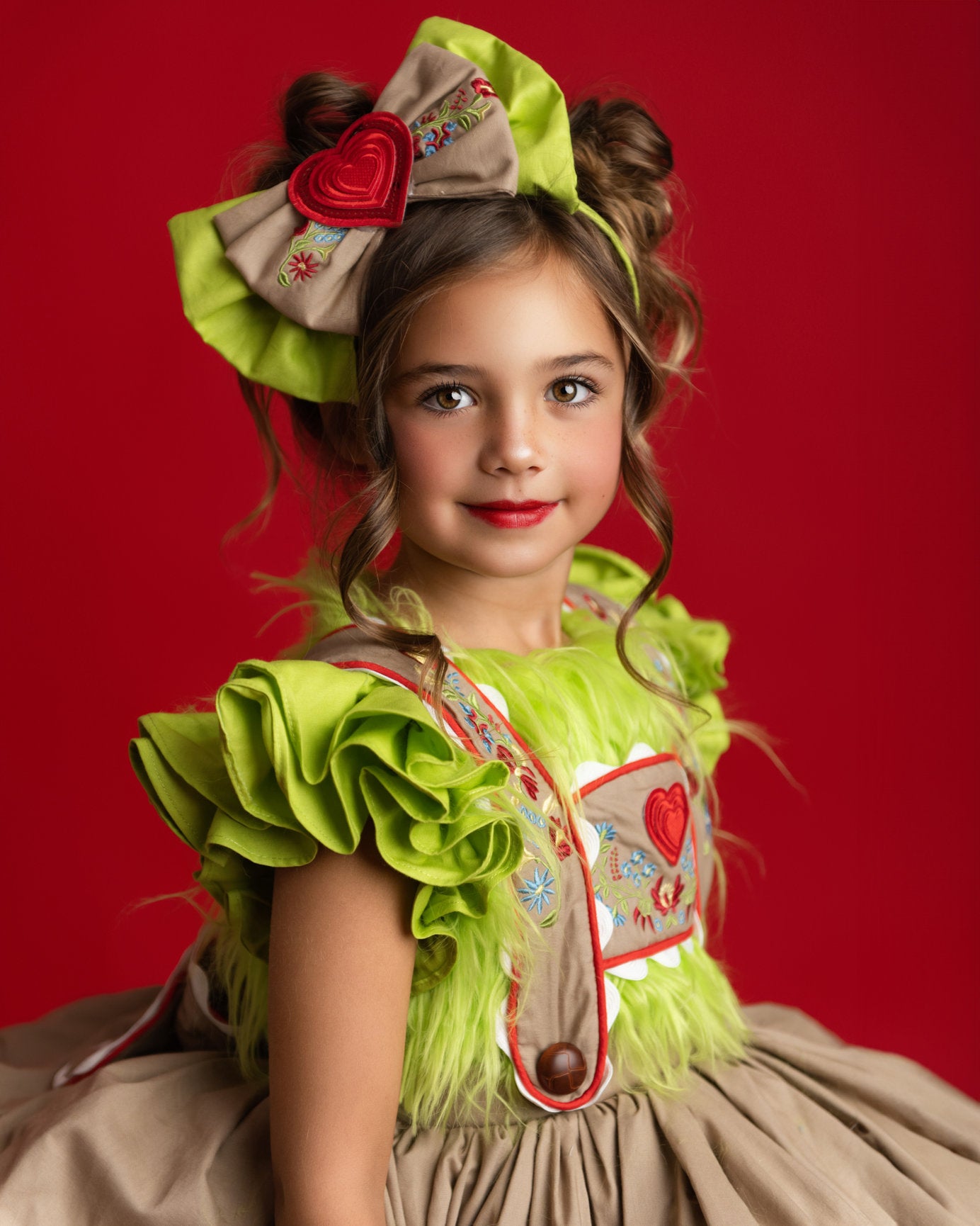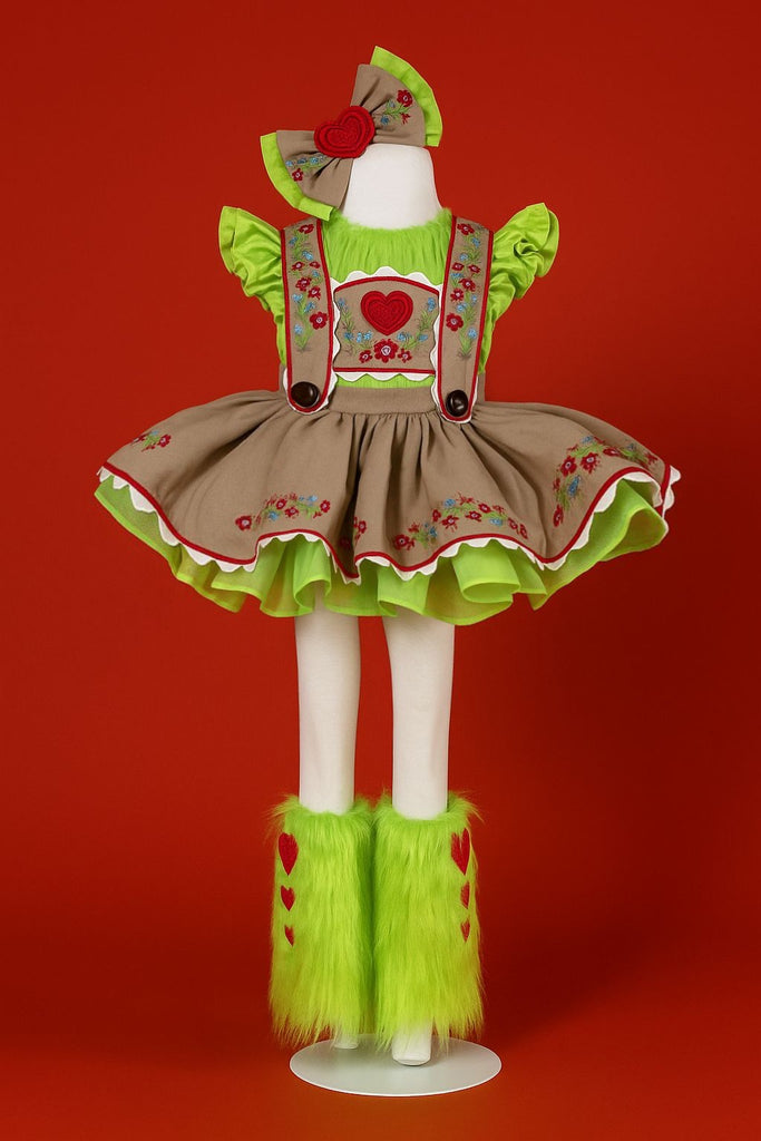 Step into a festive fairytale with this playful holiday-inspired Alpine dress set! Featuring vibrant lime green and taupe tones with red heart and floral embroidery, this design adds a cheeky twist to traditional holiday attire—perfect for those who love to stand out with sweet sass and a little mischief.