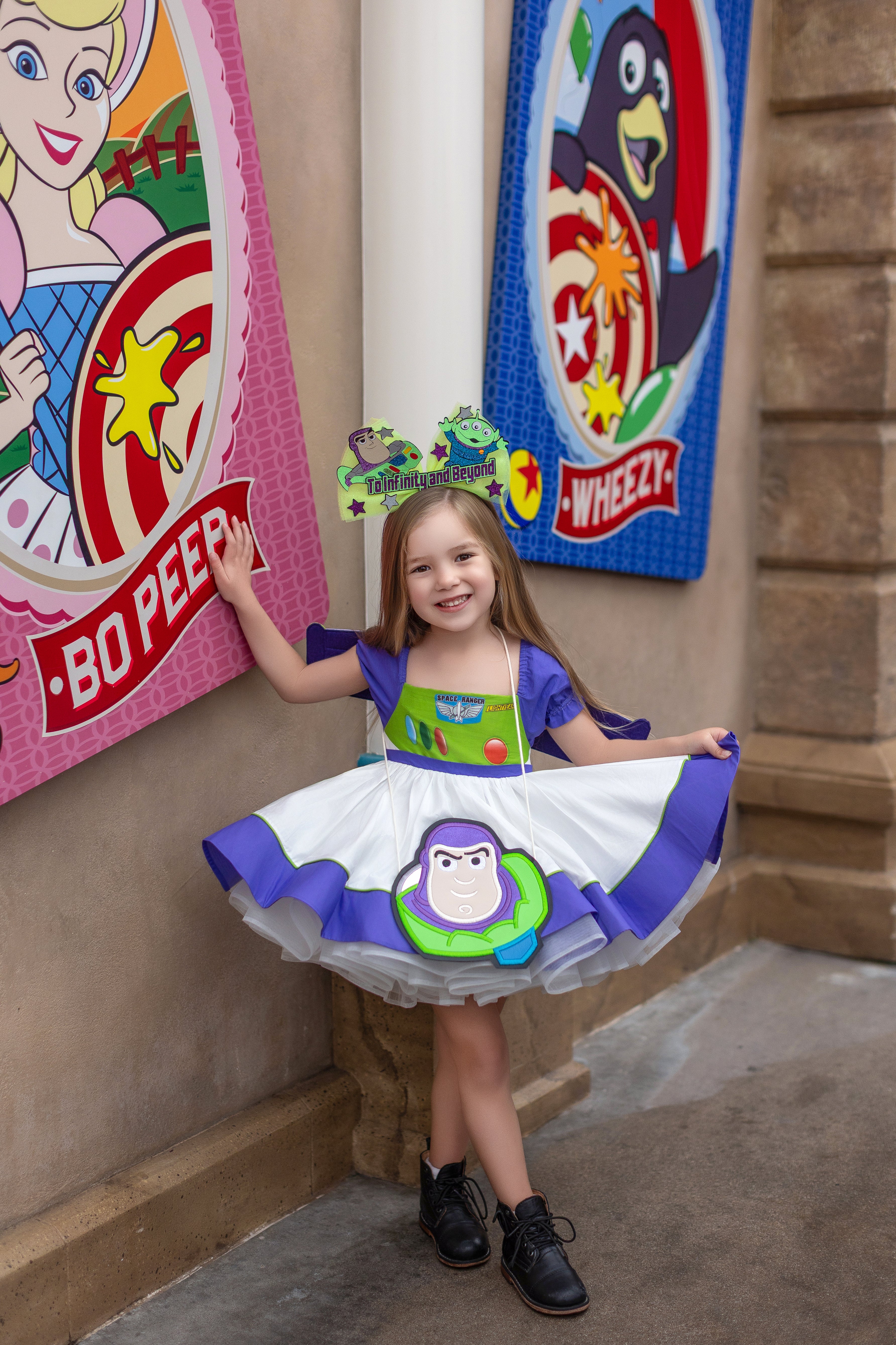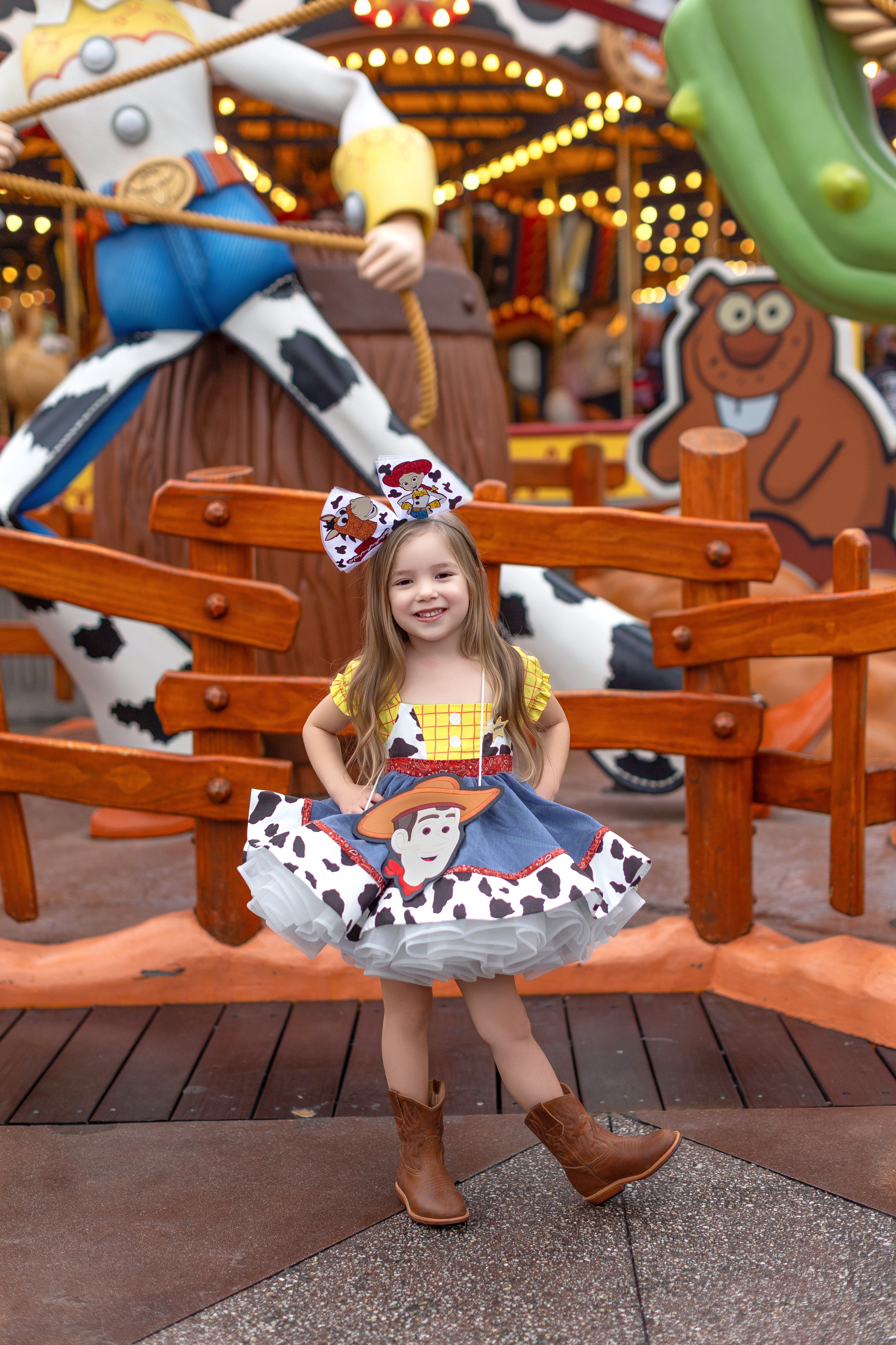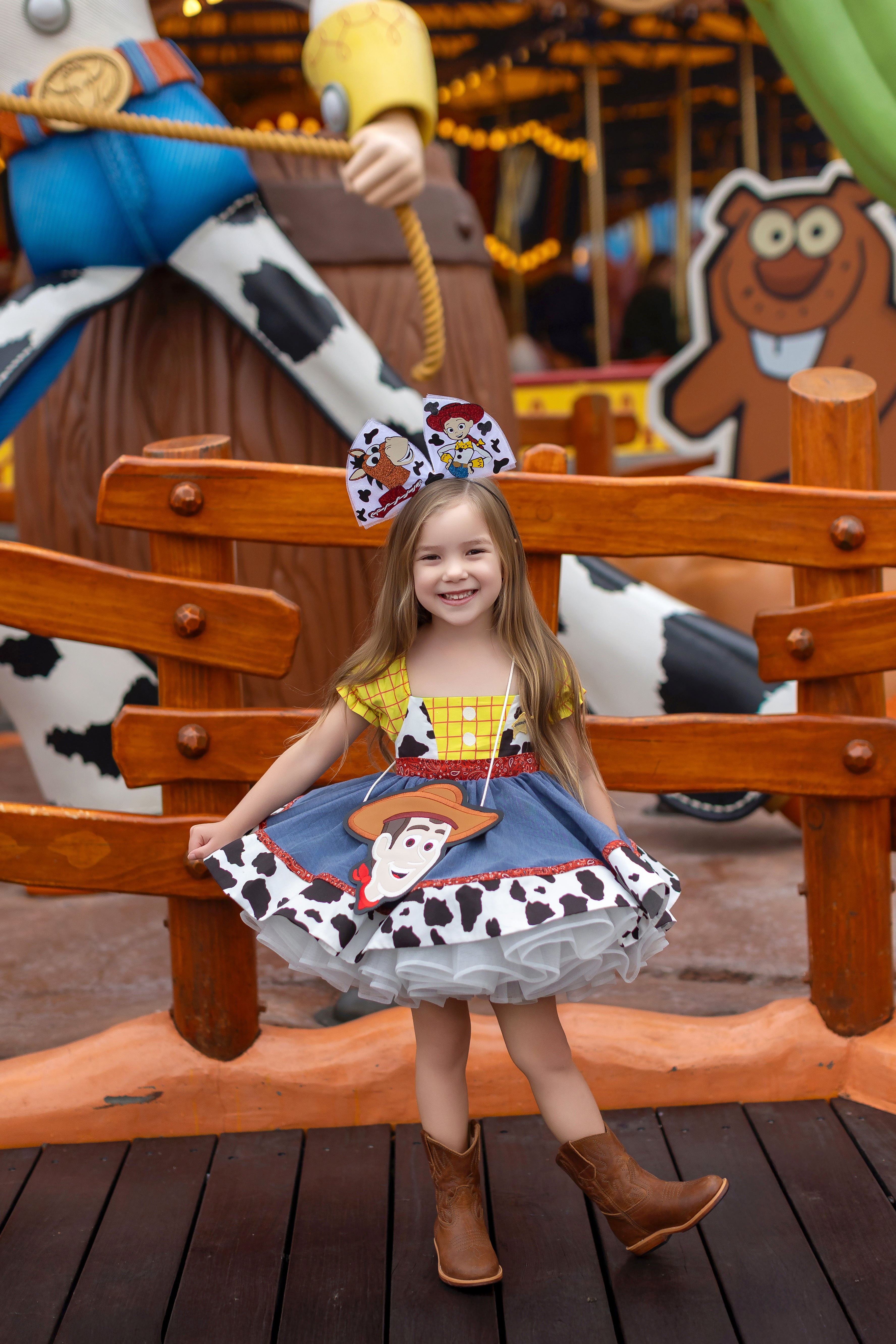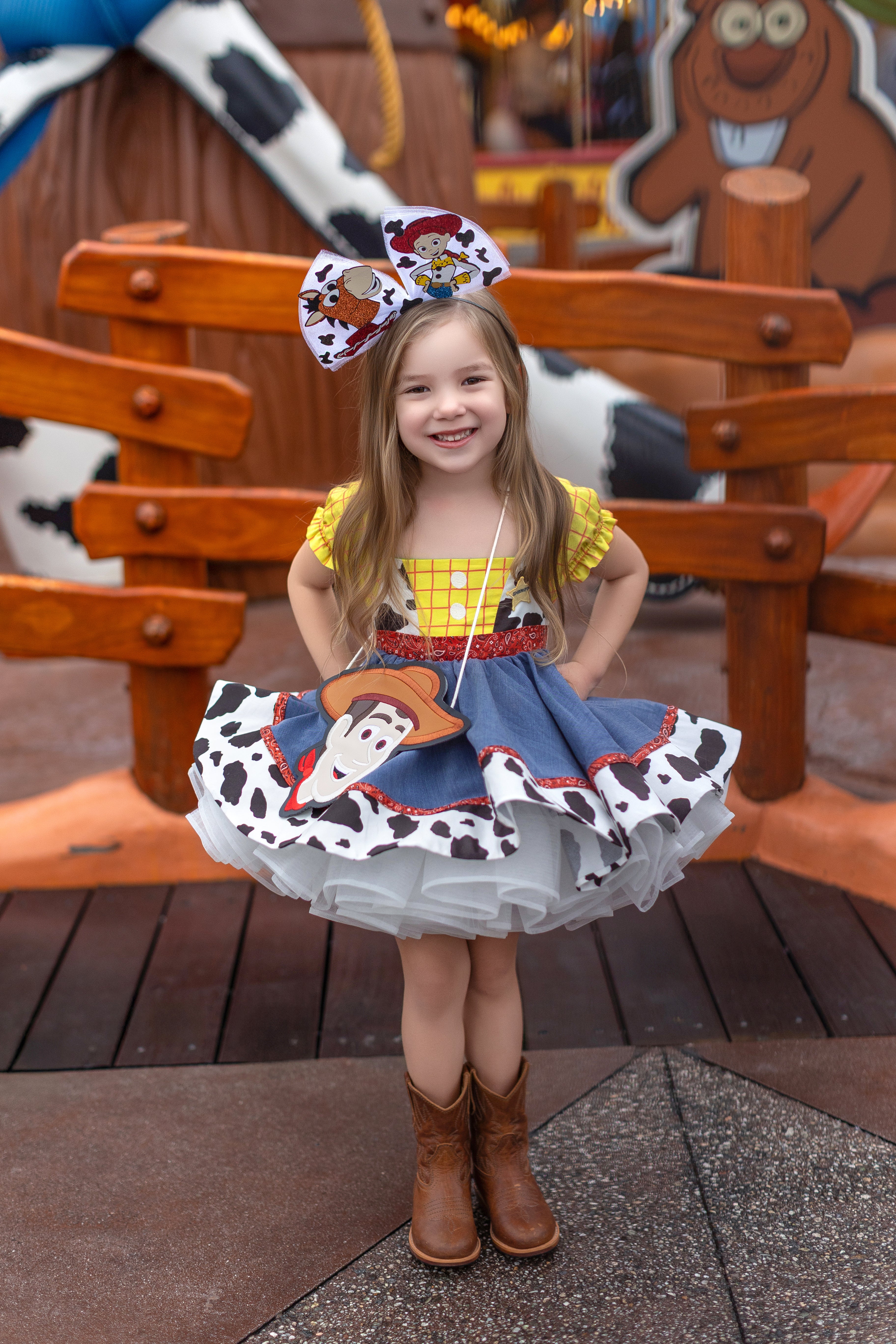 One side features a denim + cow print design with classic yellow stripped bodice and button details — inspired by everyone's favorite sheriff!