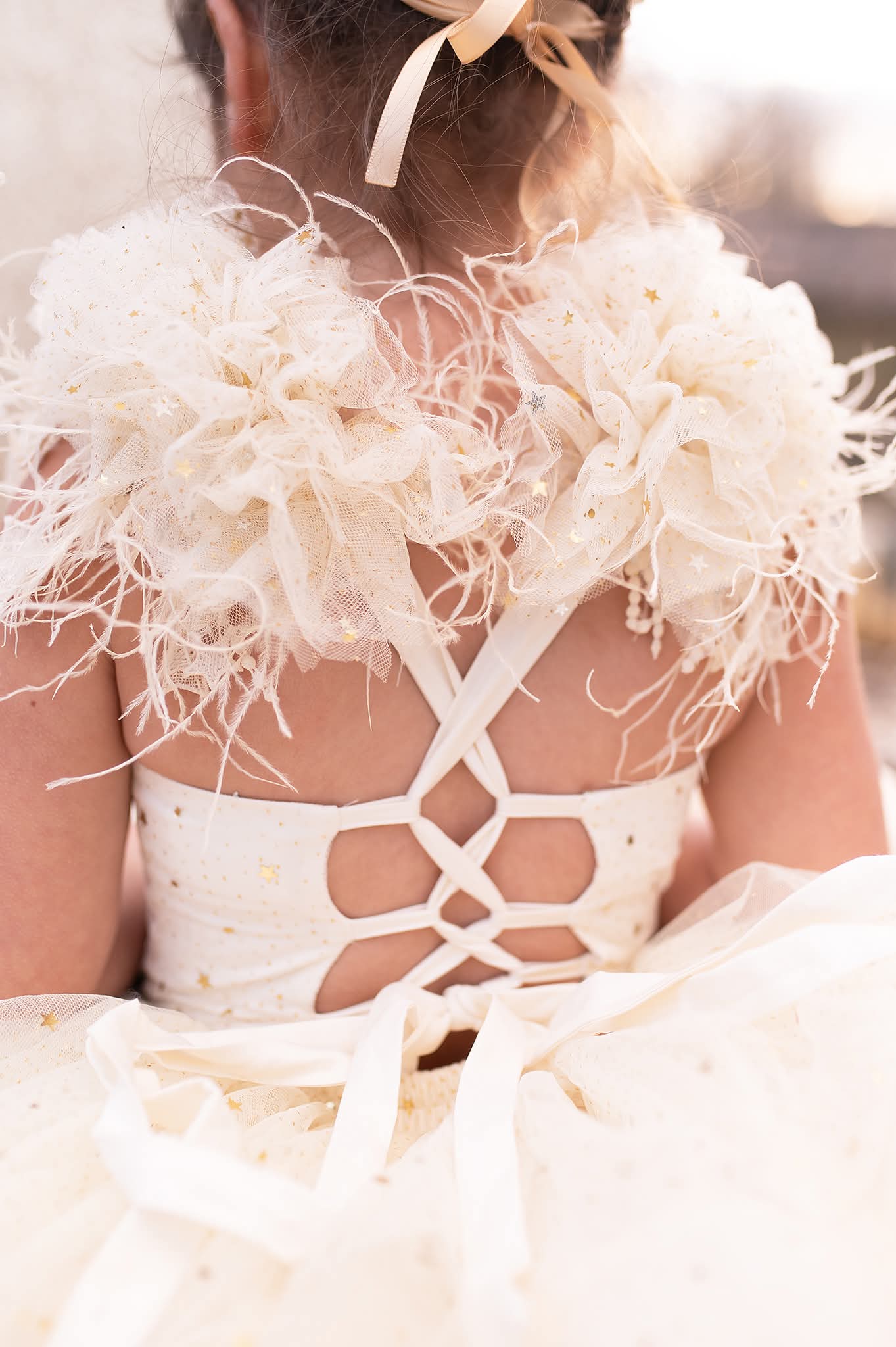 • Soft feathered shoulders for added elegance and whimsy